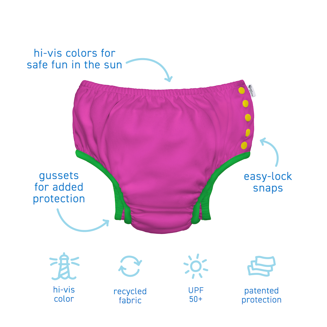 Our best selling, award-winning reusable diaper and rash guard are now available in neon safety colors to ensure little ones are safe and easy to spot in and around the water.